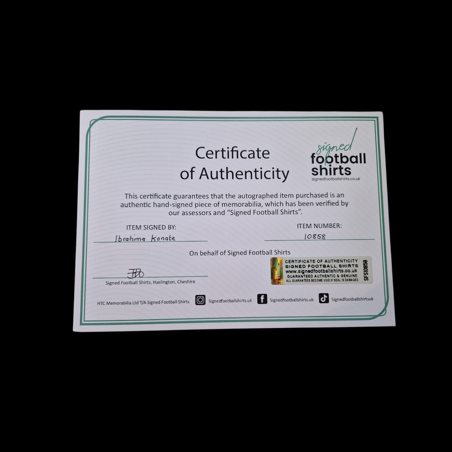 Konaté has been compared to Virgil van Dijk due to his positional play, tackling, pace and strength. Konaté is also well known for his passing and strength in the air. This 2024-25 football shirt was personally signed by Konate.
