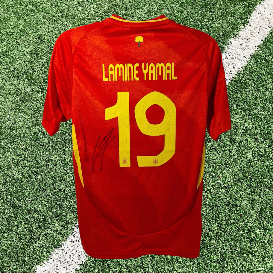 Lamine Yamal is a Spanish professional footballer who plays as a right winger or right midfielder for La Liga club Barcelona and the Spain national team. Known for his flair, chance creation, and long-distance curling goals, he is widely regarded as one of the best players in the world. He was a member of the youth academy, La Masia, before breaking into the Barcelona first team squad in the 2023–24 season. He became the youngest player to be nominated for the Ballon d'Or (at age 17) and also won the Kopa Trophy in 2024 and 2025, presented to the best young player in the world. In the following season, he was integral to Barcelona winning a domestic treble of the La Liga title, the Copa del Rey, and the Supercopa de España. At 18 years old, Yamal finished as runner-up for the 2025 Ballon d'Or.Yamal has represented Spain internationally at various youth levels, and made his debut for the senior team in 2023, becoming the youngest player to represent and score for the country at age 16. He was selected for UEFA Euro 2024, playing an important role in helping Spain win their fourth title, while also winning the tournament's Young Player Award. He holds multiple records in his international career, including the youngest player to appear in a UEFA European Championship final (at age 17), the youngest player in a European Championship (at age 16), and the youngest goalscorer in a European Championship (at age 16), this 2023 football shirt was personally hand signed by Yamal.