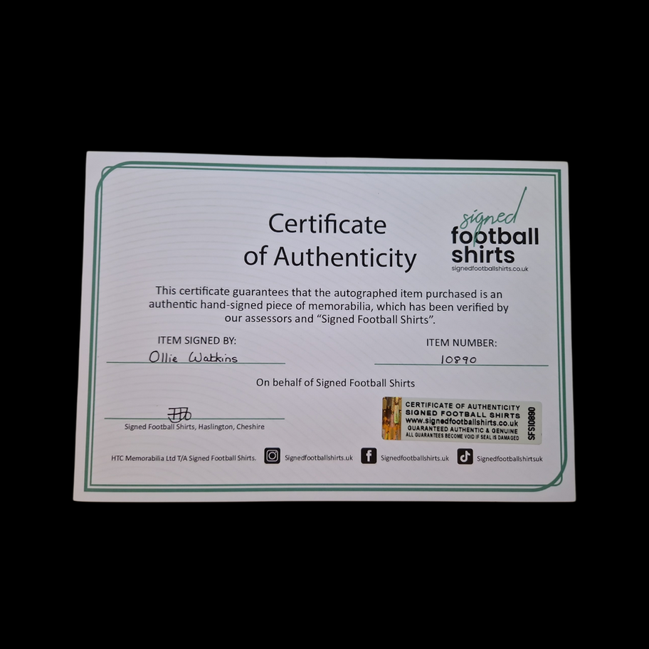 Oliver George Arthur Watkins is an English professional footballer who plays as a forward for Premier League club Aston Villa and the England national team. Described as a complete forward, Watkins is known for his finishing ability and work ethic. This 2024-25 football shirt was personally hand-signed by Watkins.